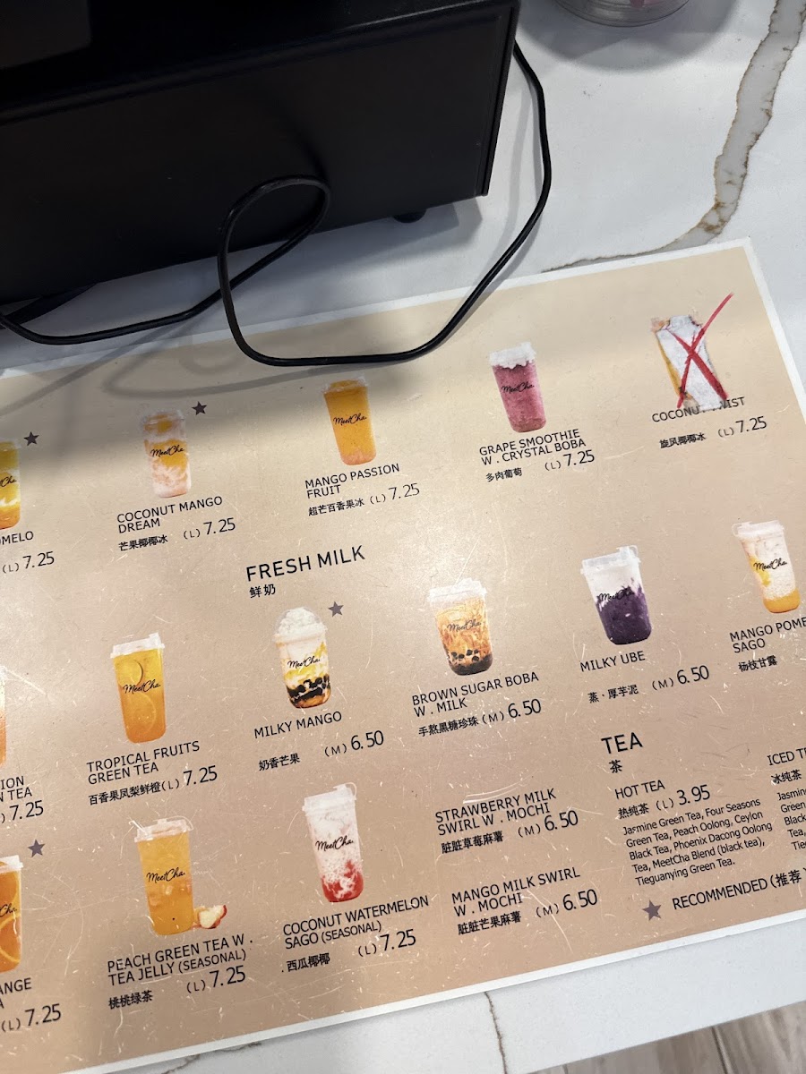 The menu at MeetCha features a diverse selection of beverages primarily focused on bubble tea and specialty teas, complemented by fresh fruit and milk-based tea options. It is organized into several categories to help visitors quickly find their preferred drink style.
